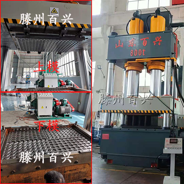 这台液压机是给杭州用户定制的800吨三梁四柱伺服系统液压机,客户用于压制由废旧塑料颗粒再加工的跑马场防滑地垫,下图是在用户现场拍摄的防滑垫液压机设备实拍图